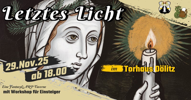 Voller Abenteuer und Geheimnisse. Lache, trinke, feiere – und vor allem: spiele mit den anderen Teilnehmern! Egal ob erfahrener LARPer oder neugieriger Neuling – bei „Letztes Licht“, unserem besonderen Jahresabschluss-Tavernenabend, bist du herzlich willkommen.