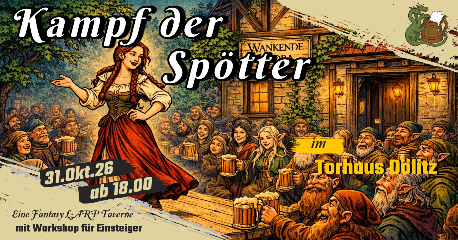 Die Wankende Hydra, die Fantasy-LARP-Taverne, lädt dich und deine Freunde herzlich zum Kampf der Spötter im Torhaus Dölitz ein.